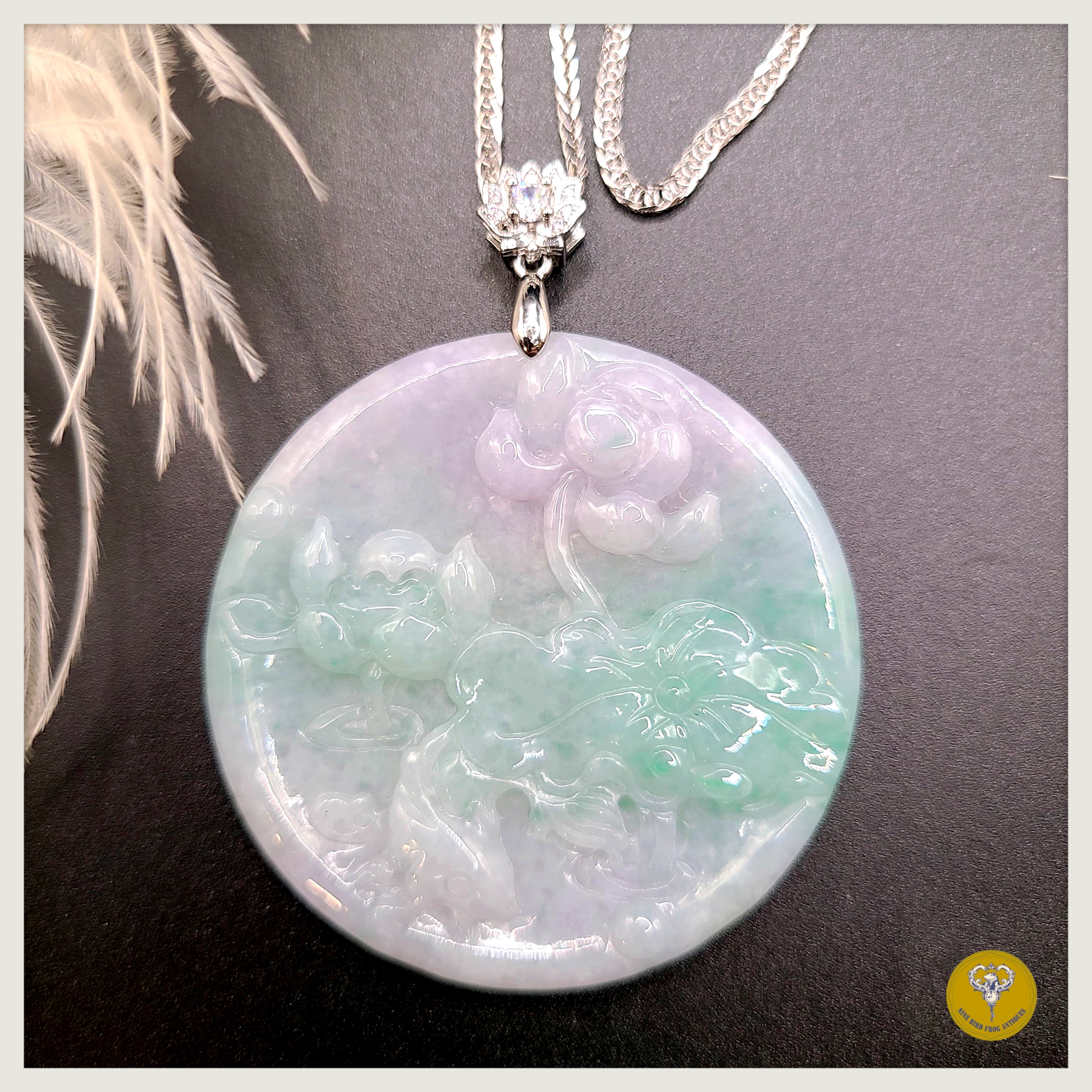 糯冰種紫羅蘭翡翠荷花雕刻吊嘴配純銀包金頸鍊