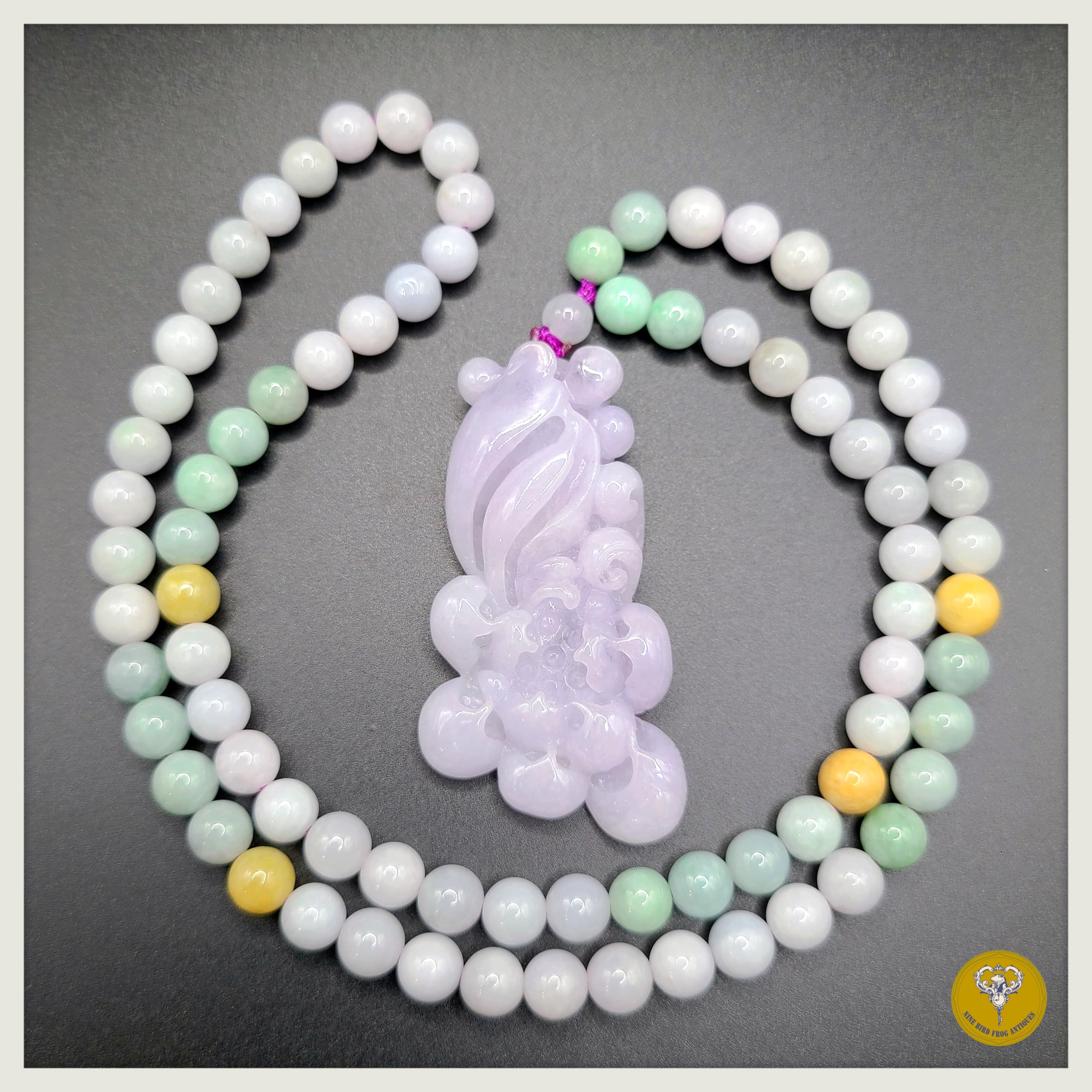 紫羅蘭糯冰種翡翠荷花吊嘴配翡翠珠鍊