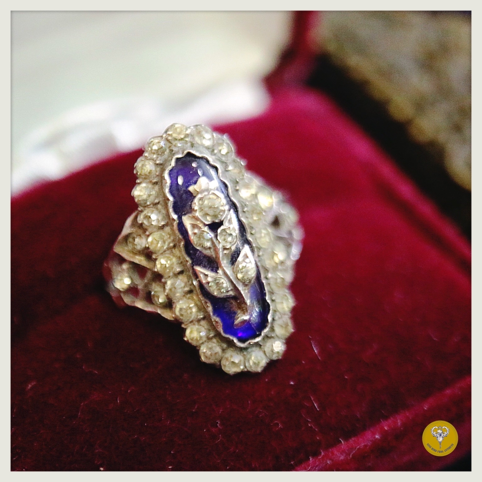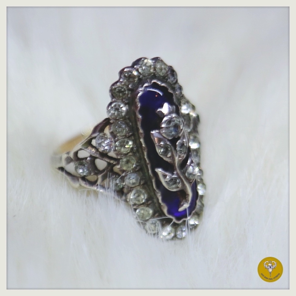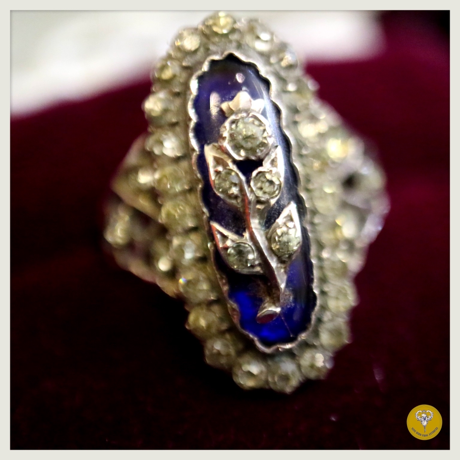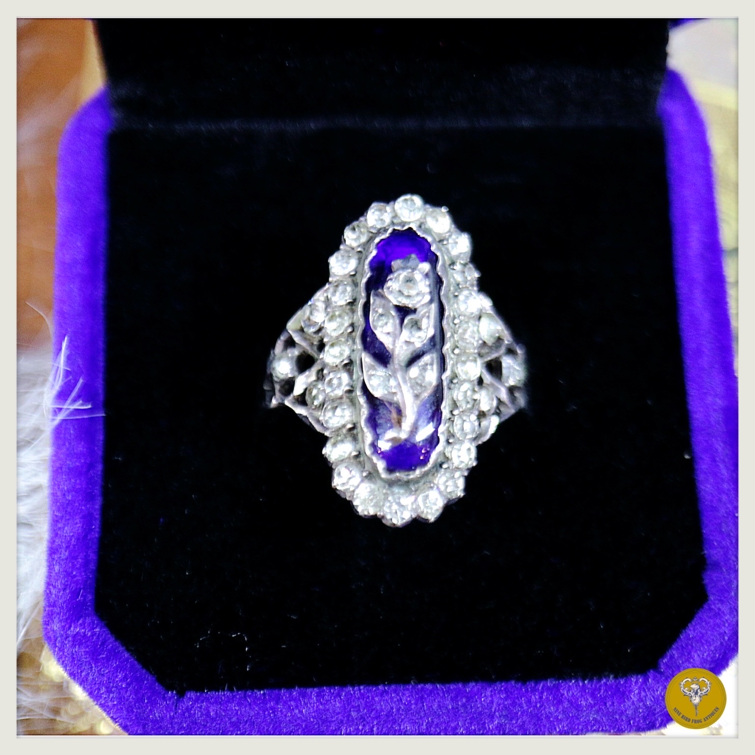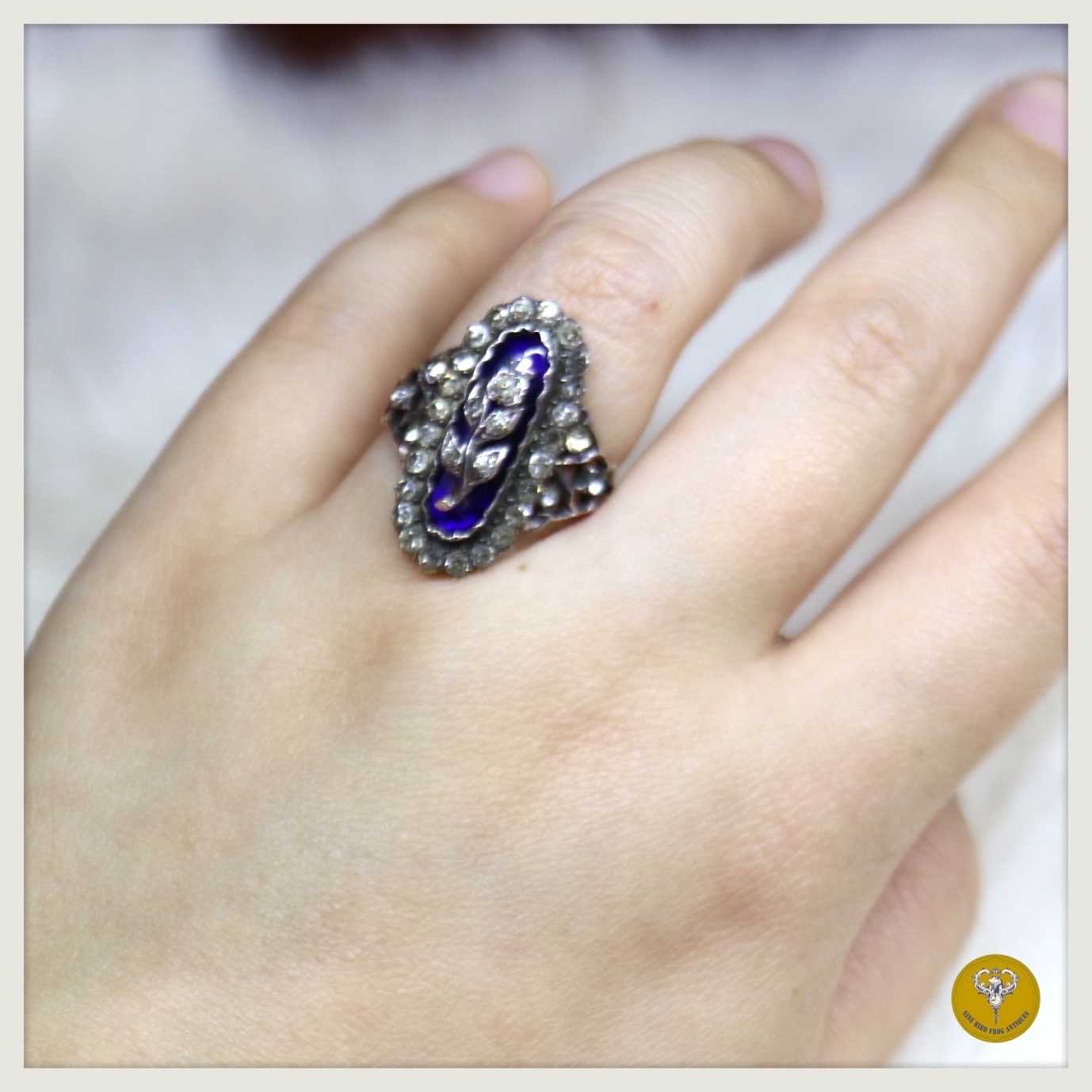 佐治時代是英國歷史上一個時期,包括佐治一二世、三世和四世四位國王在位年間,亦即1714年至1830年。佐治時代發展出別具一格的藝術風格,包括絲帶作品、蝴蝶和花葉。 這枚戒指採用典型的佐治時代揉合希臘風格的設計,琺瑯皇家藍戒面,配上paste手工玻璃製成,花葉藝術圖案,非常精緻。 當時鑽石和金、銀都是極度罕有,不是一般人可以負擔。Paste首飾在Georgian period 作為鑽石替代品而大受歡迎。Paste 是手工切割的玻璃,用金屬粉末拋光,直到它像寶石一樣閃閃發光。金屬則採用當時流行的銀頂實心 10K 金。 Georgian戒指年代久遠,精心製作,又反映時代的浪漫主義運動。 這些戒指設計有複雜的細節,價錢不比真鑽真金低。 Size:HK15(材質特別,不建議改size)