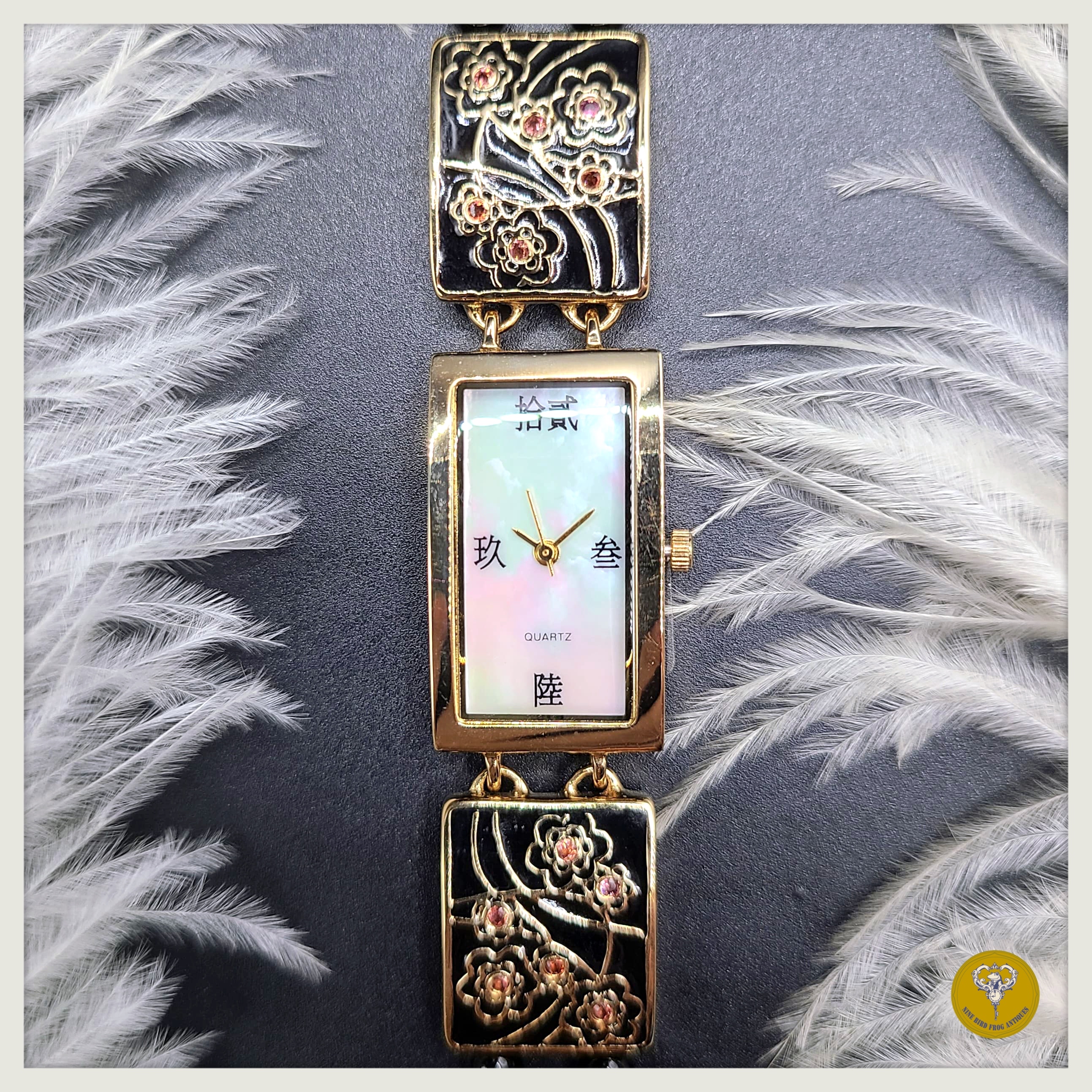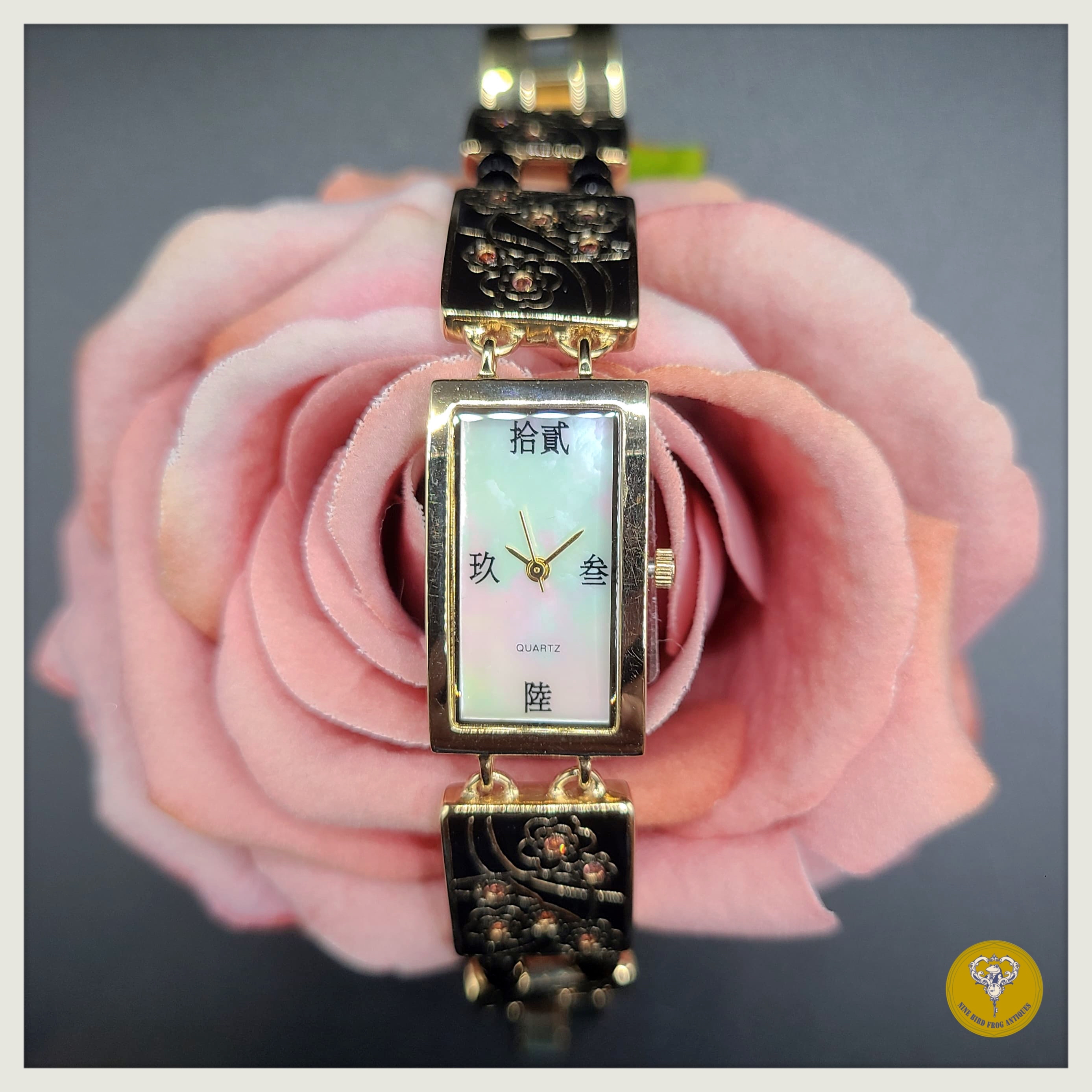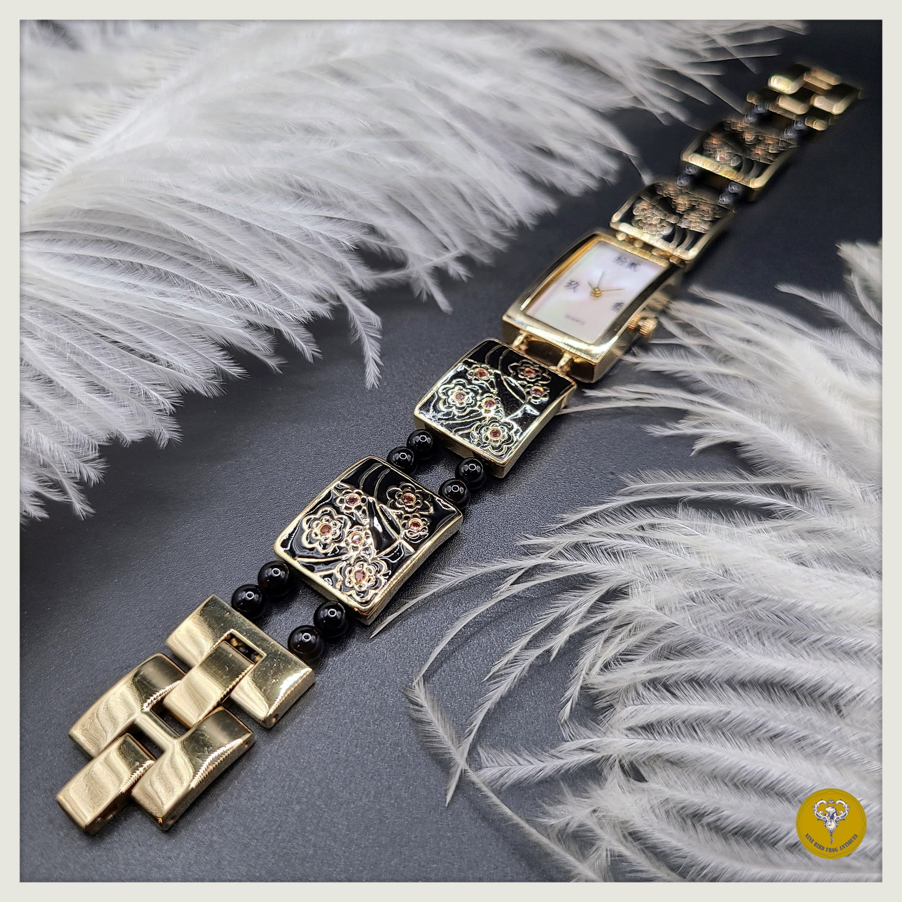 這首飾錶的設計源自大馬士革風格,黑金的組合復古而精緻,最特別的金色花心上竟是天然石榴石鑲嵌,手工是非一般的精緻,錶盤是幻彩白貝母配上中國古典數字,錶鍊則由天然黑瑪瑙鍊組成,還有可拆除變小的錶扣,不僅是一般手錶、手鍊,也可以是藝術品般的收藏。 錶面16x25mm 錶長19cm,4段拆扣,可變成16.5cm