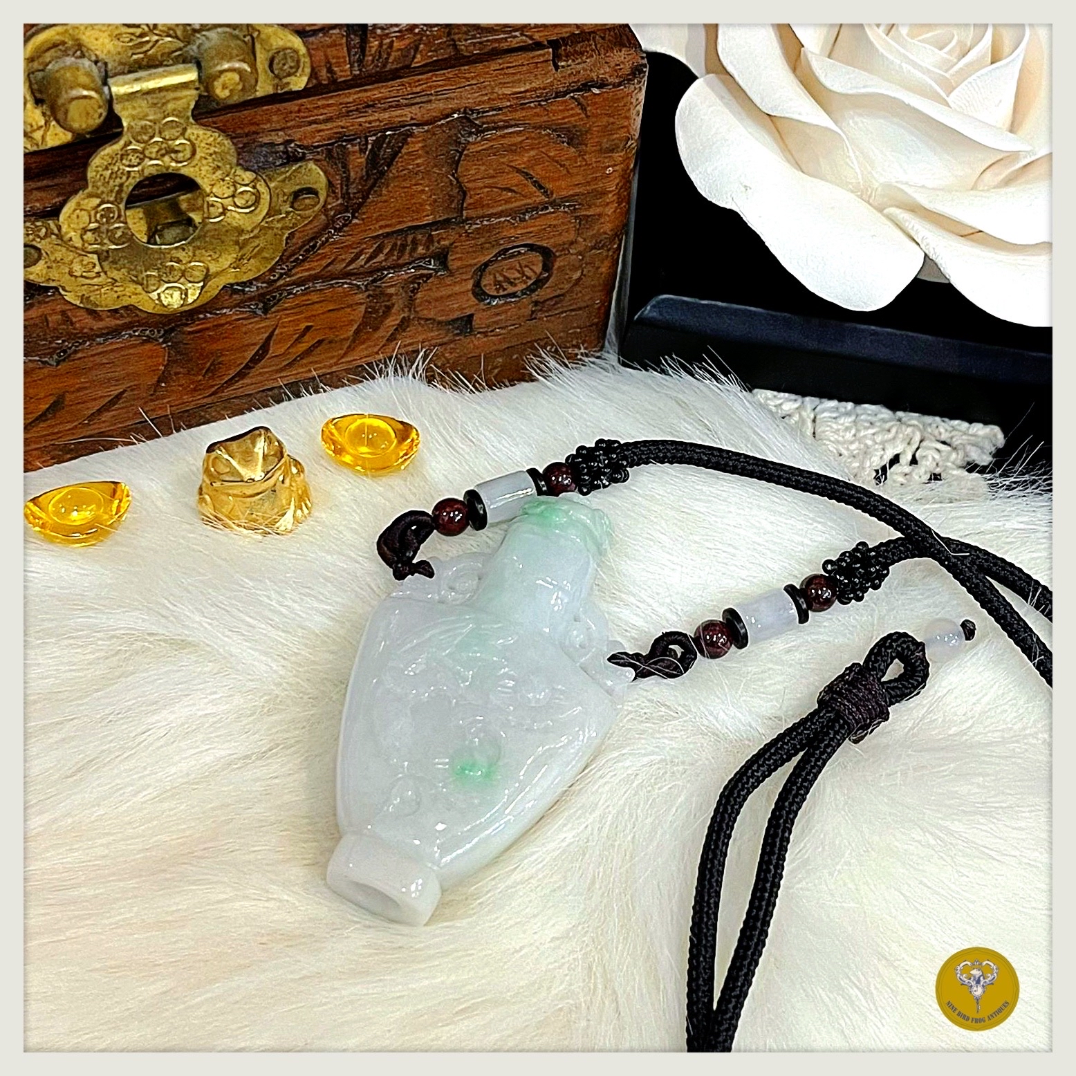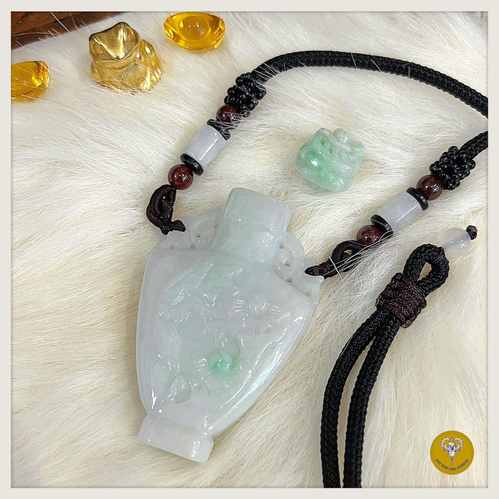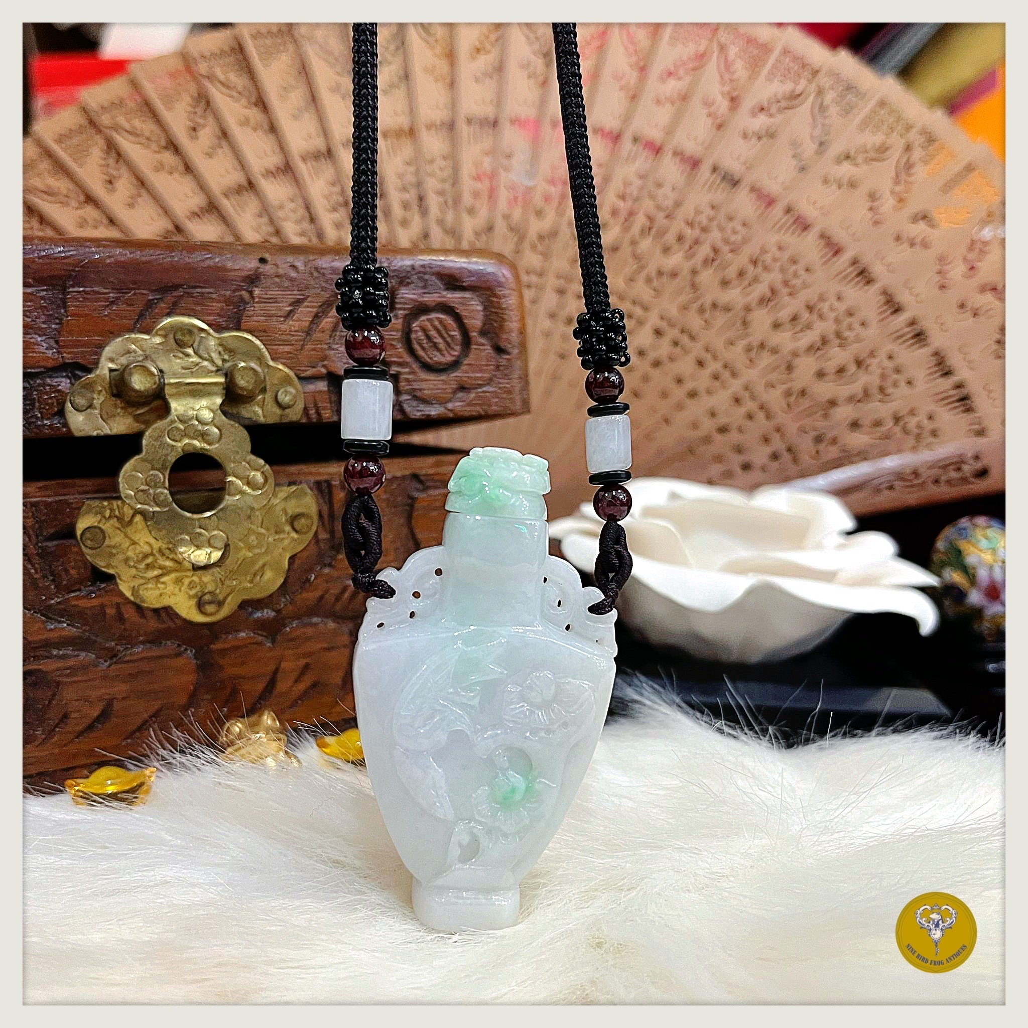 翡翠花瓶吊嘴既可作觀賞的花瓶擺件,也可以掛在頸上作為特別的頸鍊,別緻精緻。這是糯冰種的緬甸翡翠,備有A貨證書。春彩料的果綠與冰白並重,玉質細膩有光澤,配合舊工藝全人手雕刻,一邊雕刻蝠鼠與花開富貴,另一邊是蝠鼠金錢與如意。瓶蓋刻有立體雕花,更用雕工刻成螺絲瓶口,像真的寶瓶開合,可以置物。 寶瓶:6.5x4cm 繩長:66cm 附證書