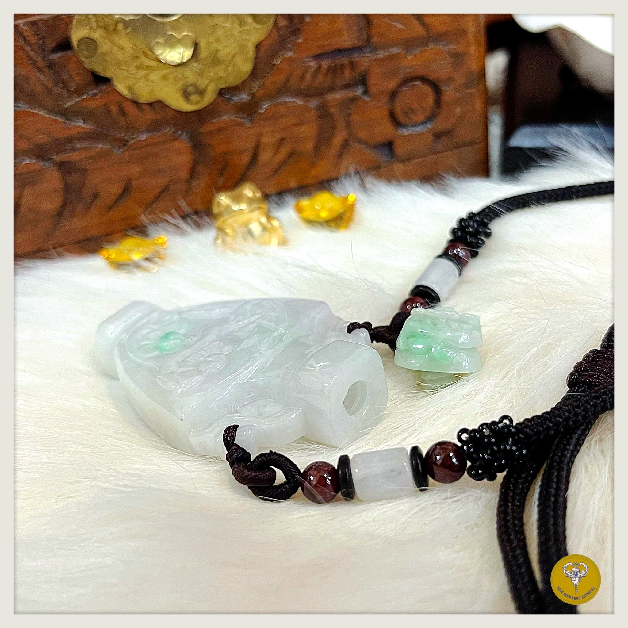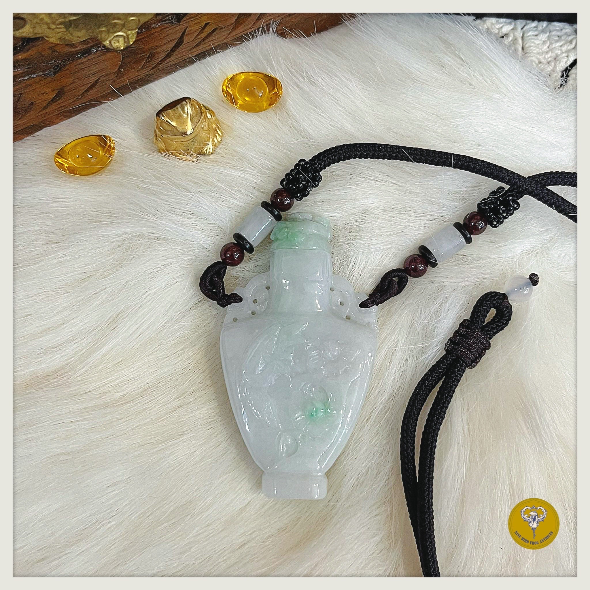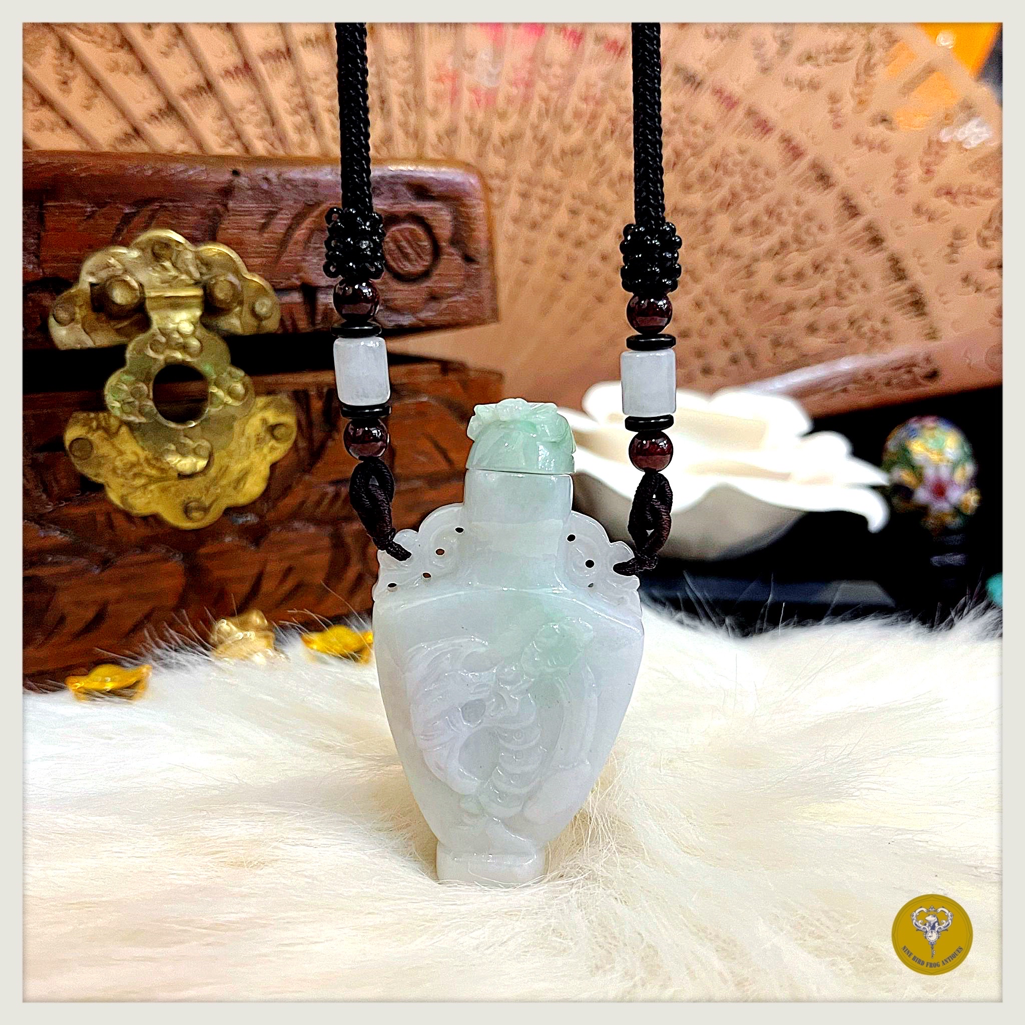 翡翠花瓶吊嘴既可作觀賞的花瓶擺件,也可以掛在頸上作為特別的頸鍊,別緻精緻。這是糯冰種的緬甸翡翠,備有A貨證書。春彩料的果綠與冰白並重,玉質細膩有光澤,配合舊工藝全人手雕刻,一邊雕刻蝠鼠與花開富貴,另一邊是蝠鼠金錢與如意。瓶蓋刻有立體雕花,更用雕工刻成螺絲瓶口,像真的寶瓶開合,可以置物。 寶瓶:6.5x4cm 繩長:66cm 附證書