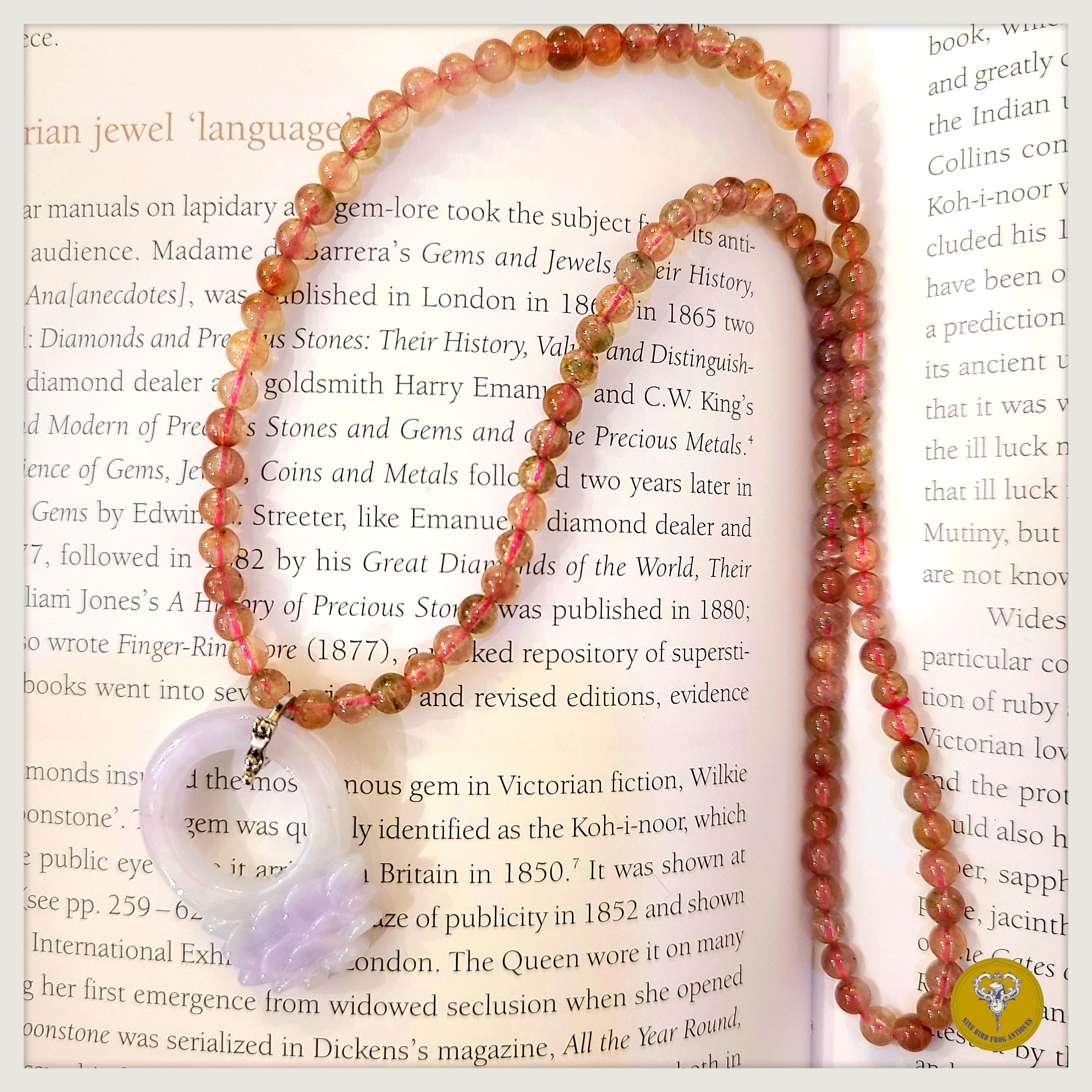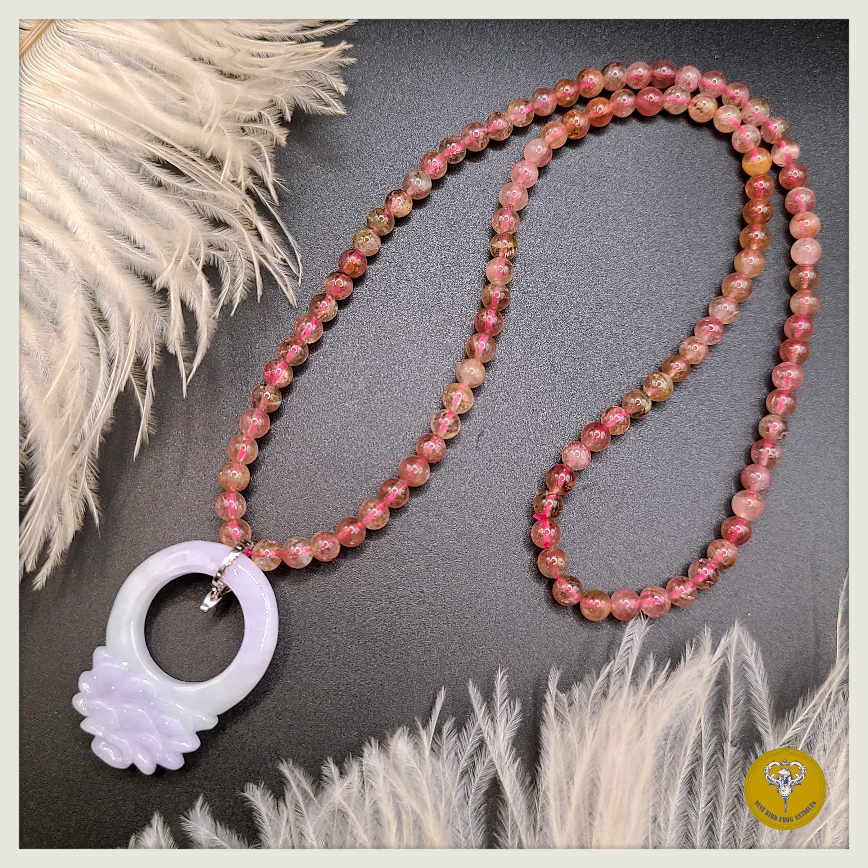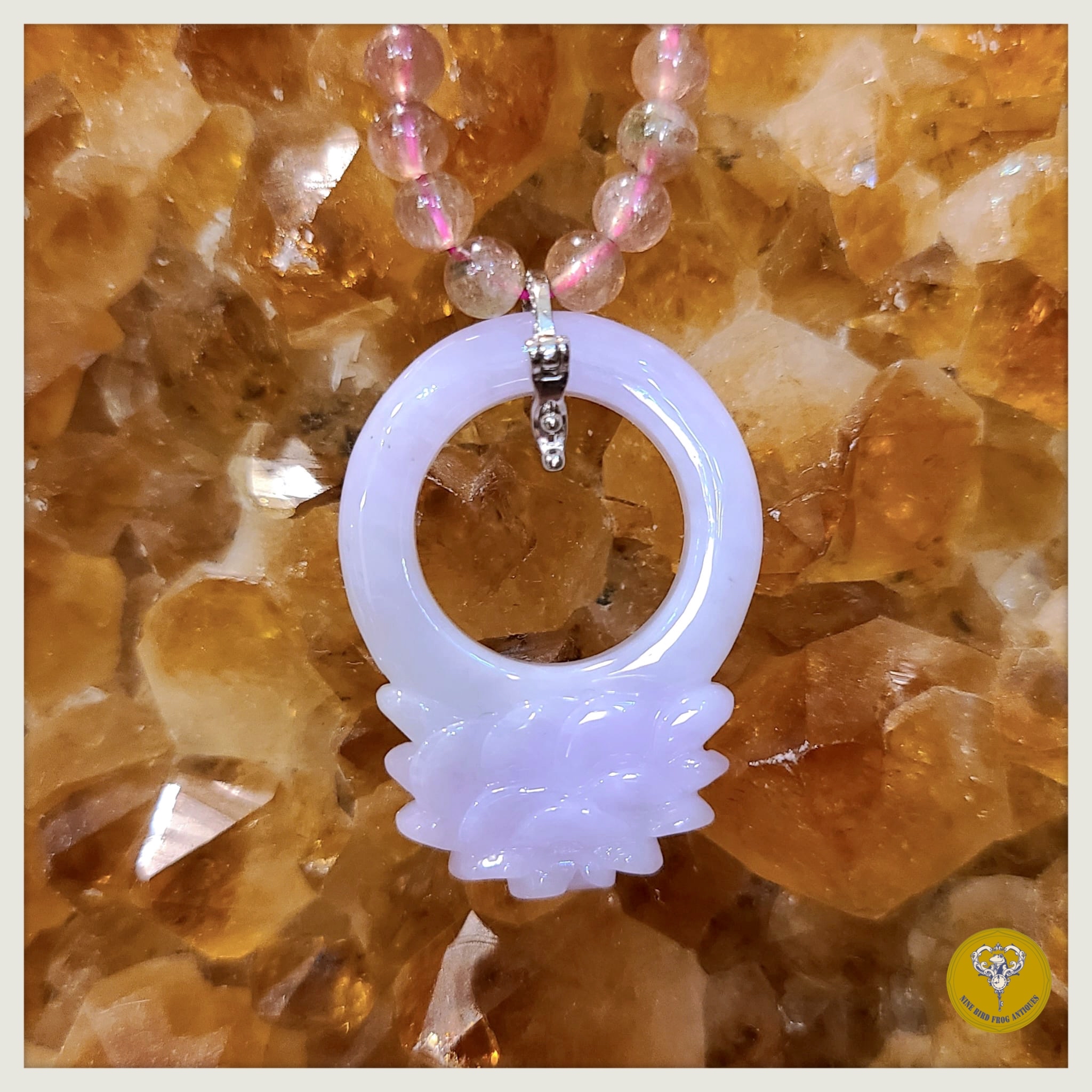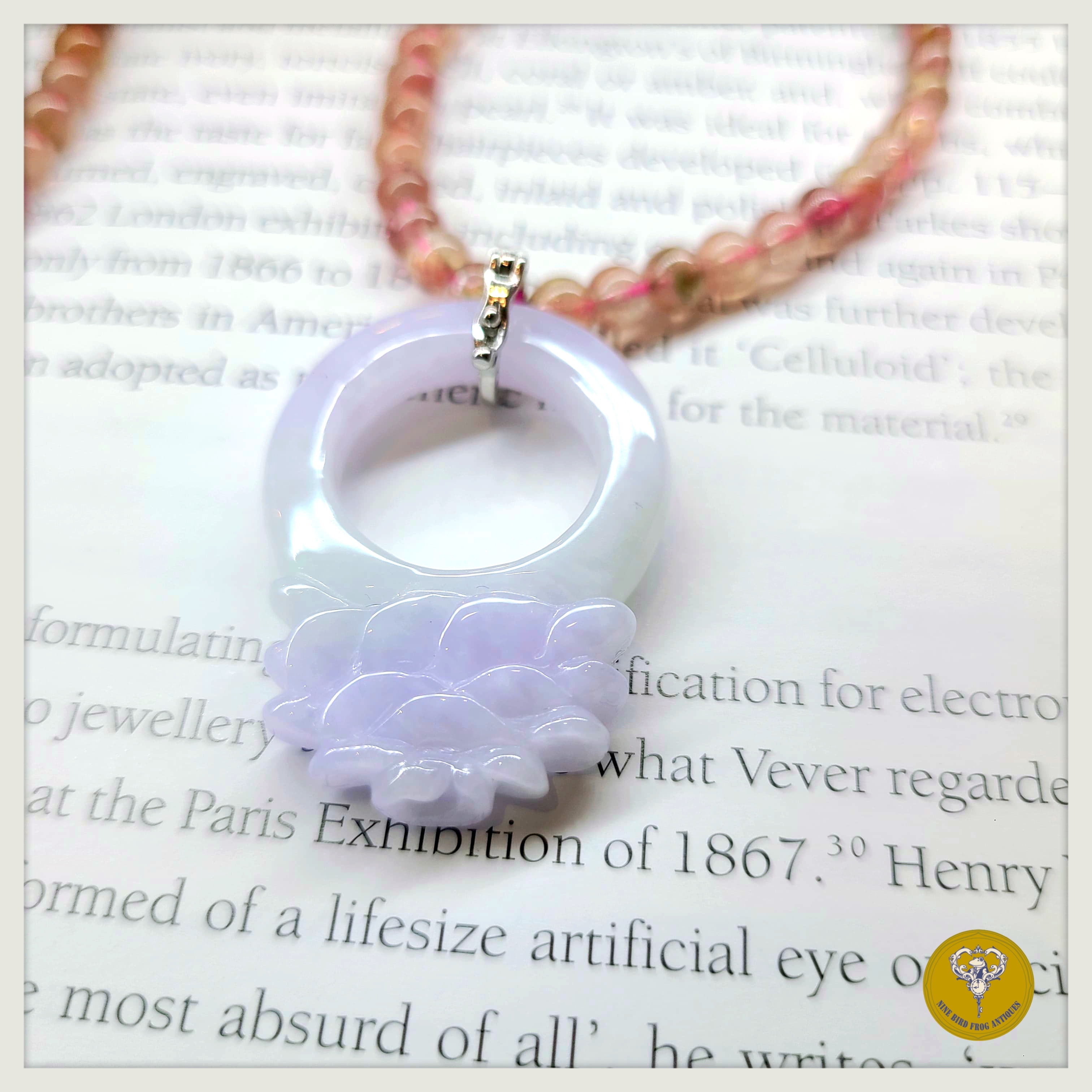 紫羅蘭糯冰種翡翠荷花吊嘴配草莓晶珠鍊