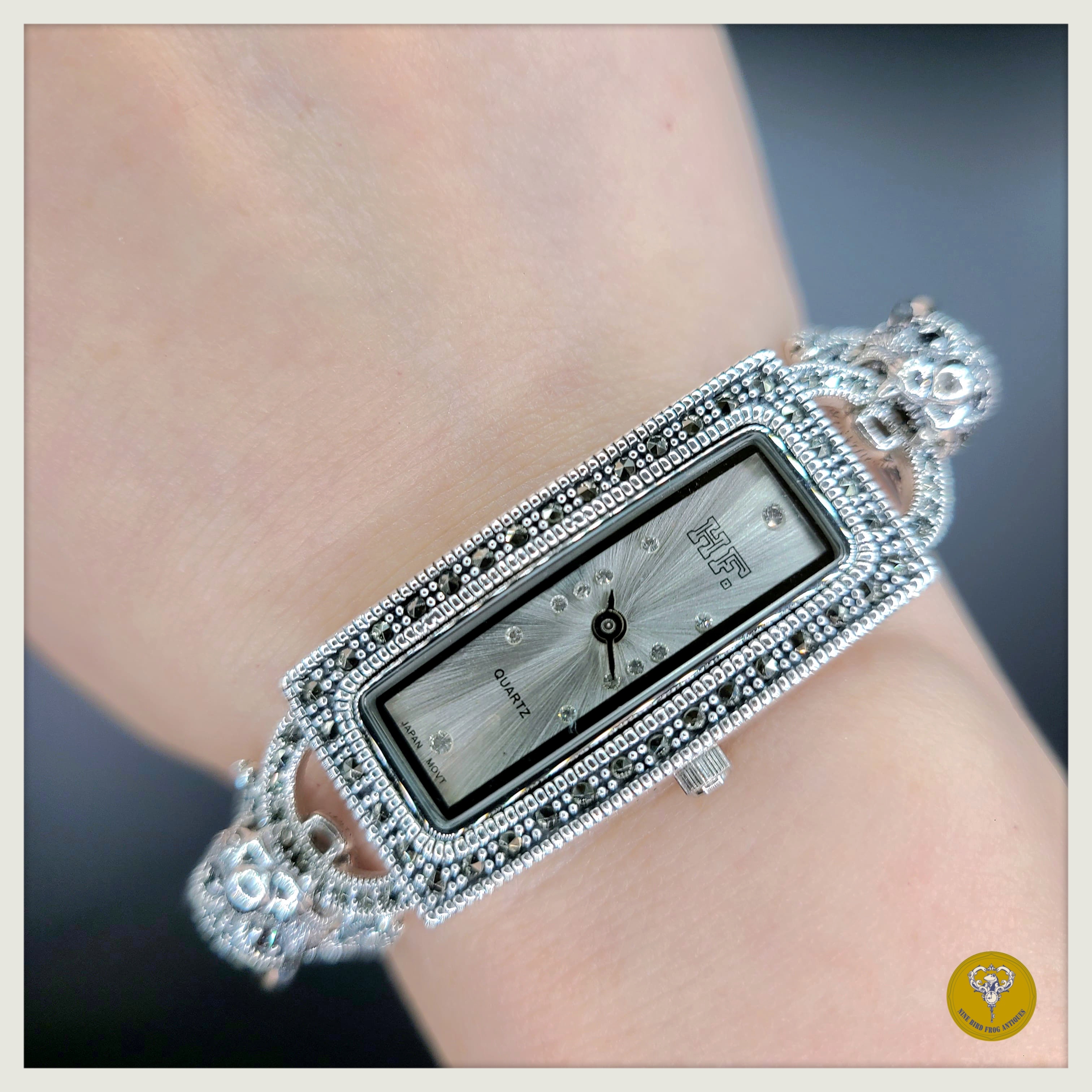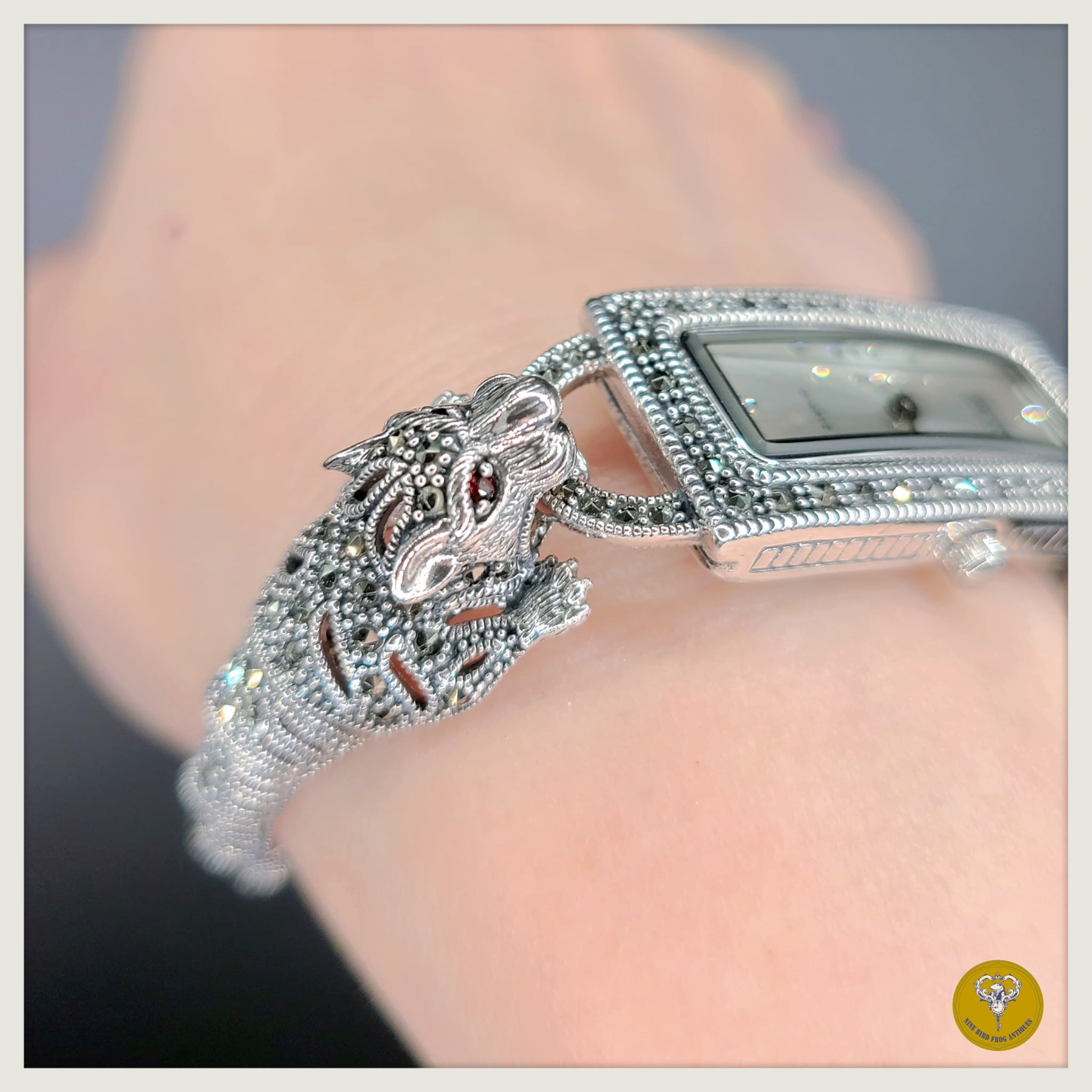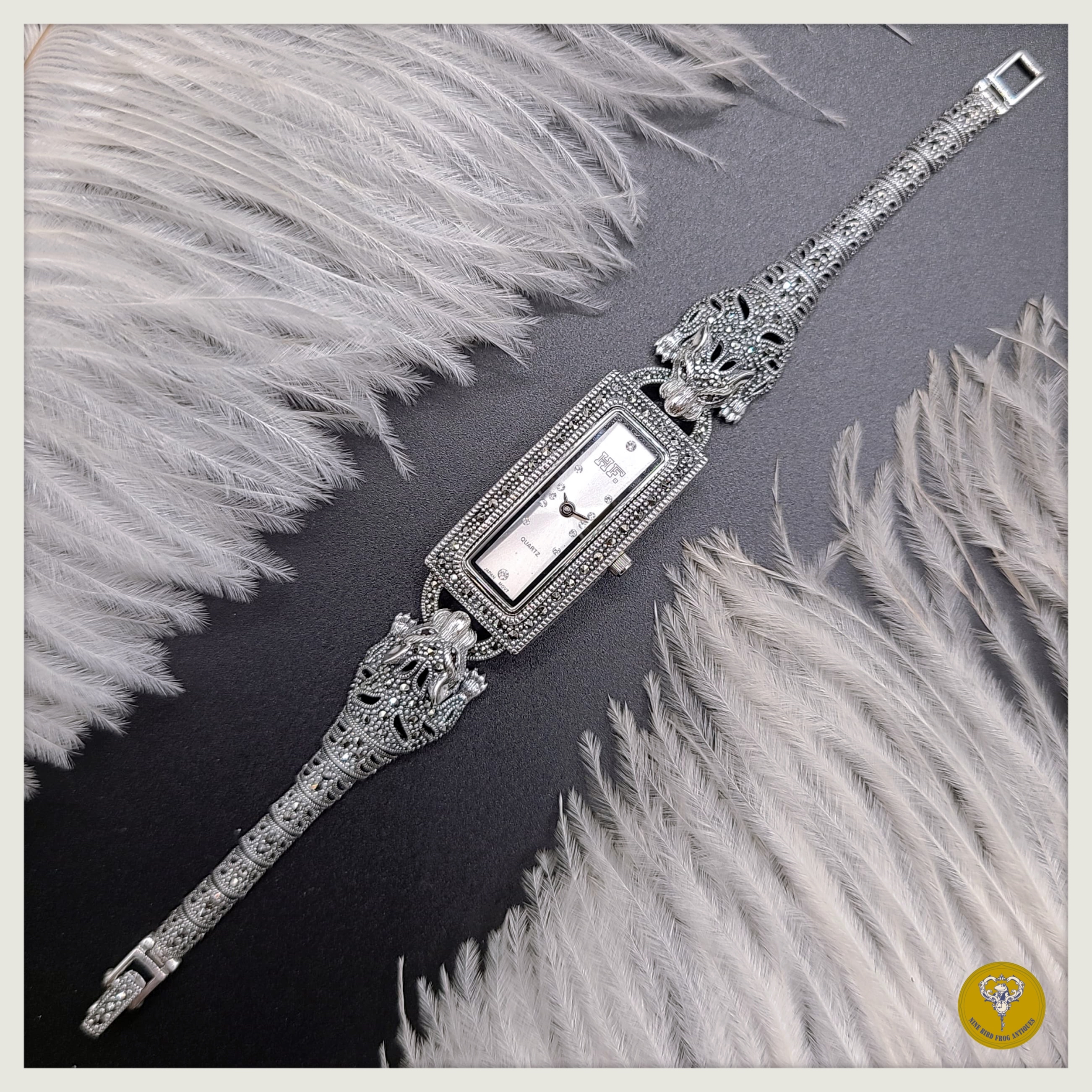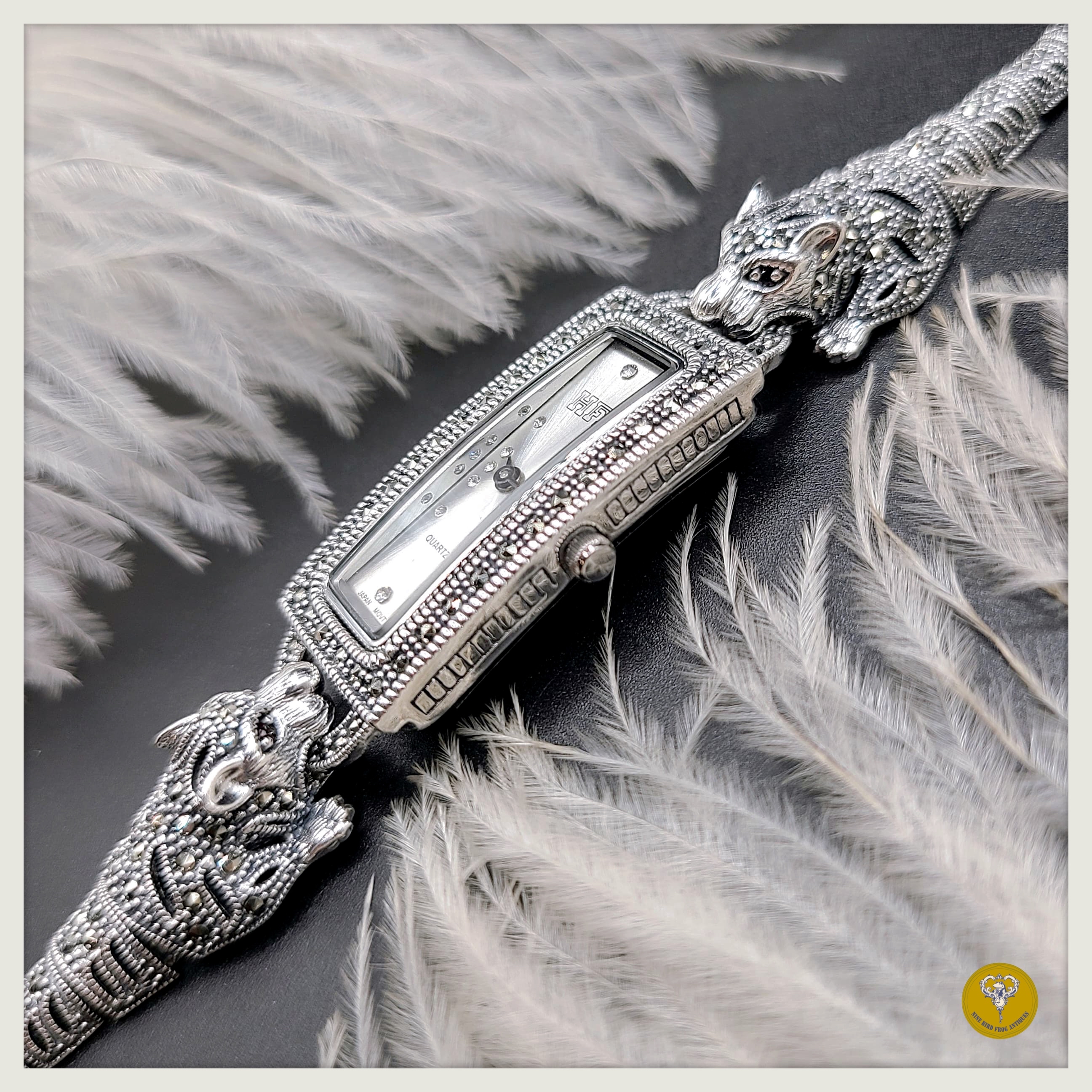 黃鐵礦石的vintage珠寶錶鍊,兩側是兩隻立體的豹,延伸出整條立體錶鍊,咬著長方形的錶盤,型格又有獨特的古典味。錶鍊鑲上滿滿不同大小的黃鐵礦石,高低有致,華麗閃耀,全部純銀邊位都有點珠花,連扣位也鑲滿黃鐵礦石。這是庫存新錶,日本機芯運作良好。