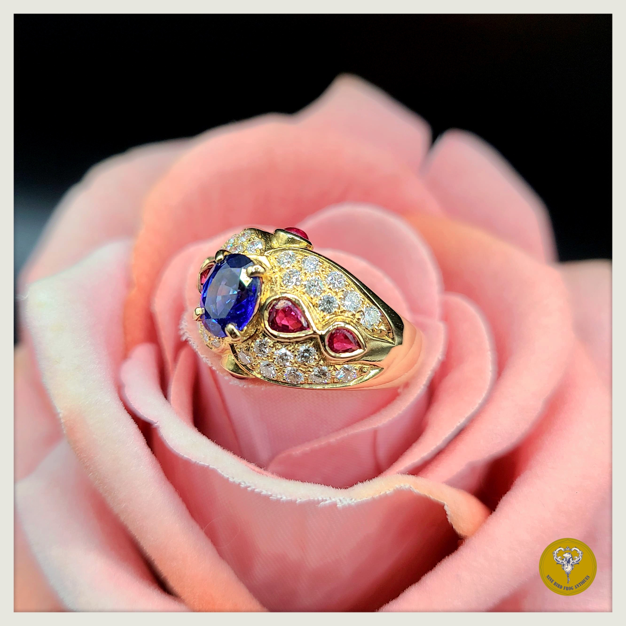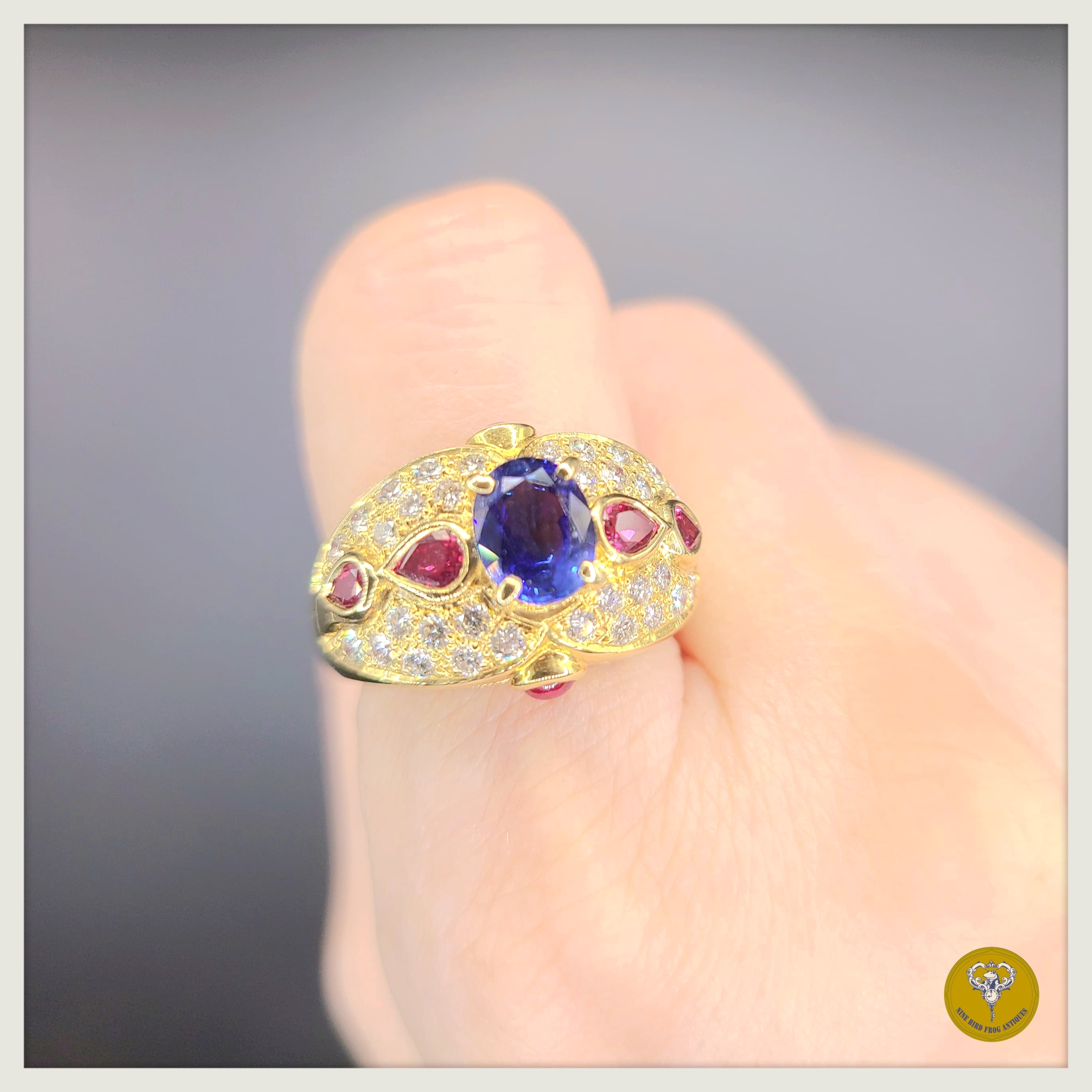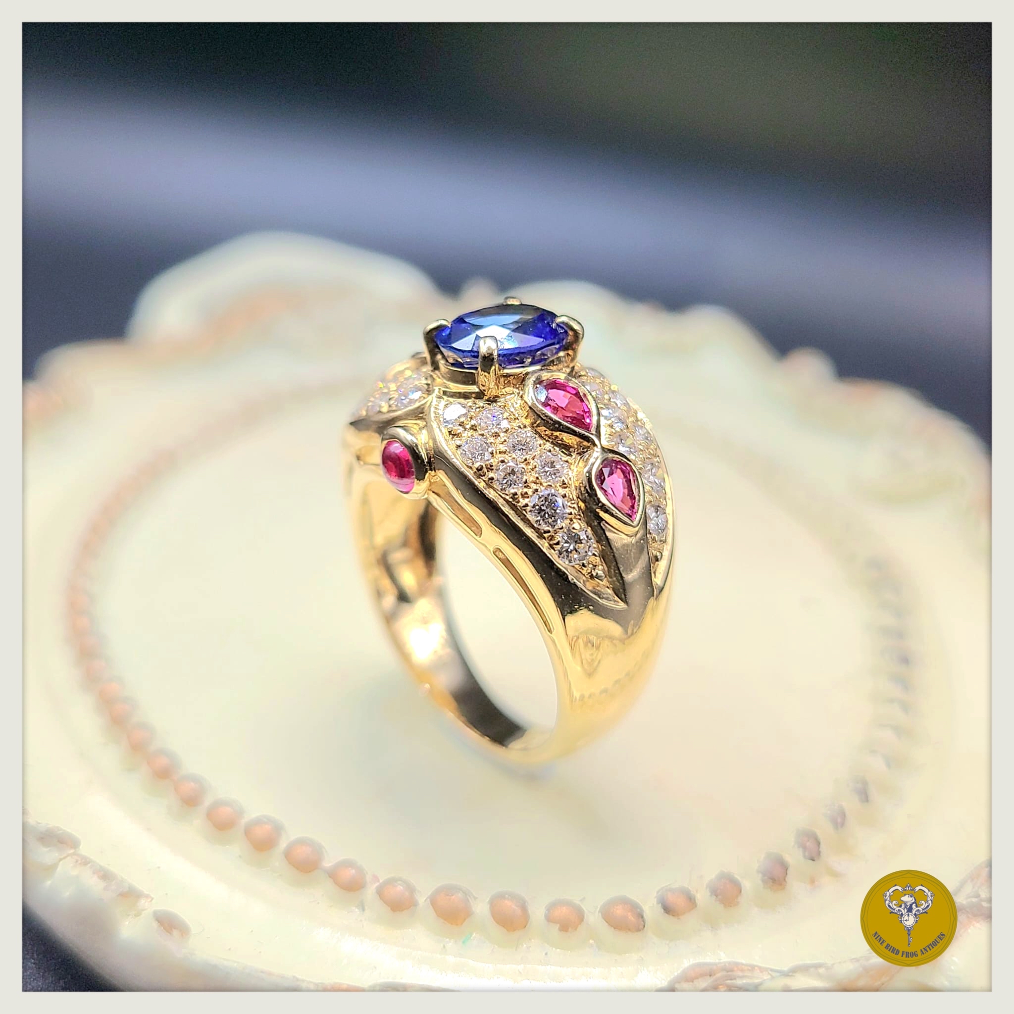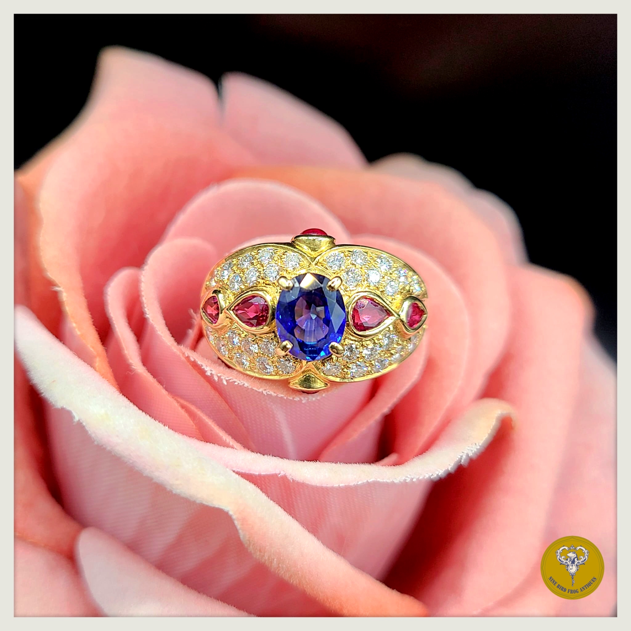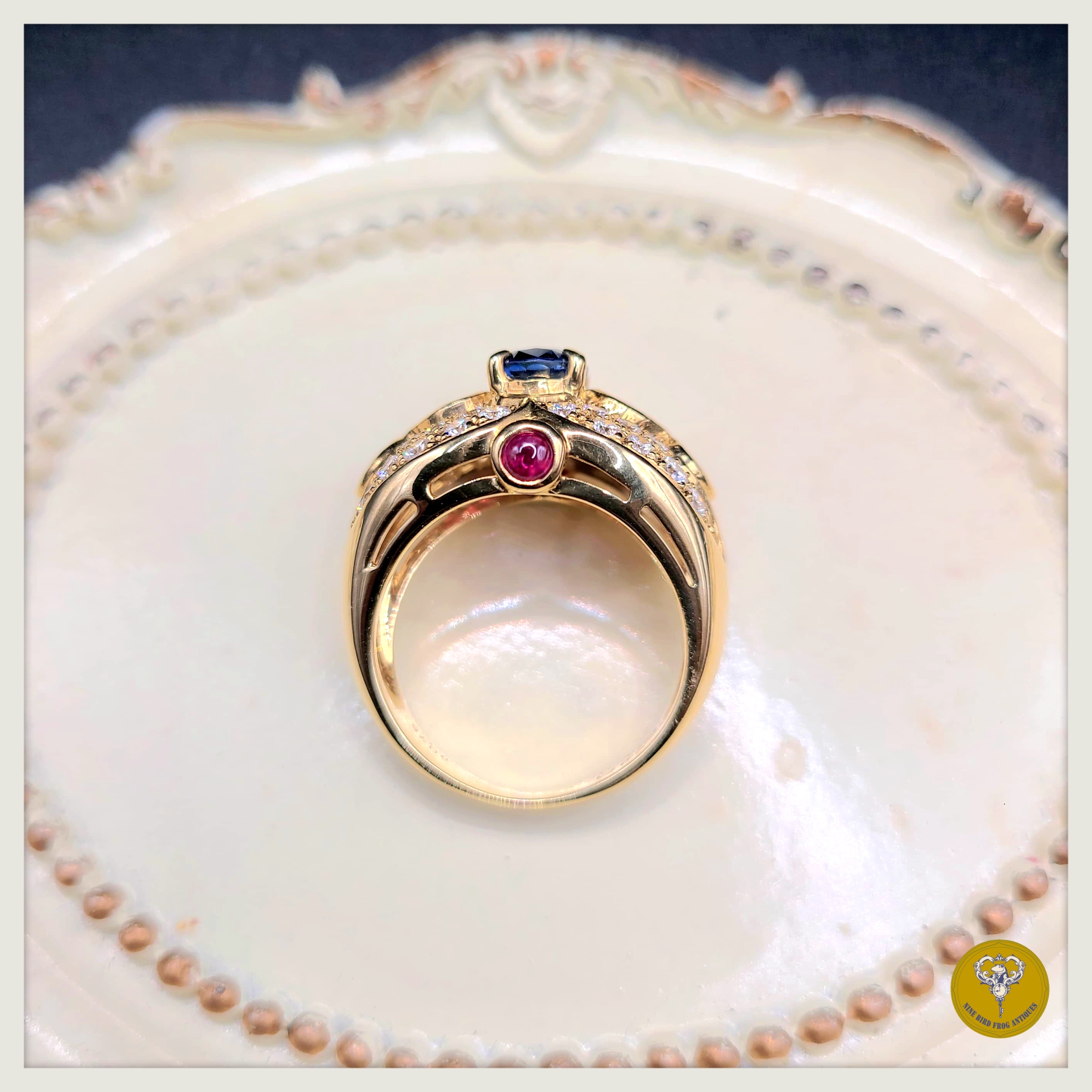 此寶石鑽戒是來自50年代仿古皇冠的設計,靈感來自愛德華時期,當時珠寶設計加入了弧線、花環,以及心形等明朗圓潤的元素,後來被稱作為「花環」風格或「典雅」風格。這隻戒指以弧線及流線型的複雜設計,以高臺托起中間的藍寶石,伴有4顆馬眼型紅寶石,18k金的戒圈鑲滿鑽石流線優雅,做出多層設計,側面正中更有兩顆圓型紅寶石,黃金相當厚實立體的高臺令手指更修長幼細,無論任何時代配戴都顯得高貴易襯。 藍寶石0.71ct 紅寶石0.9ct 鑽石0.75ct 金重9g Size:HK13.5(免費改小,改大需補金價)