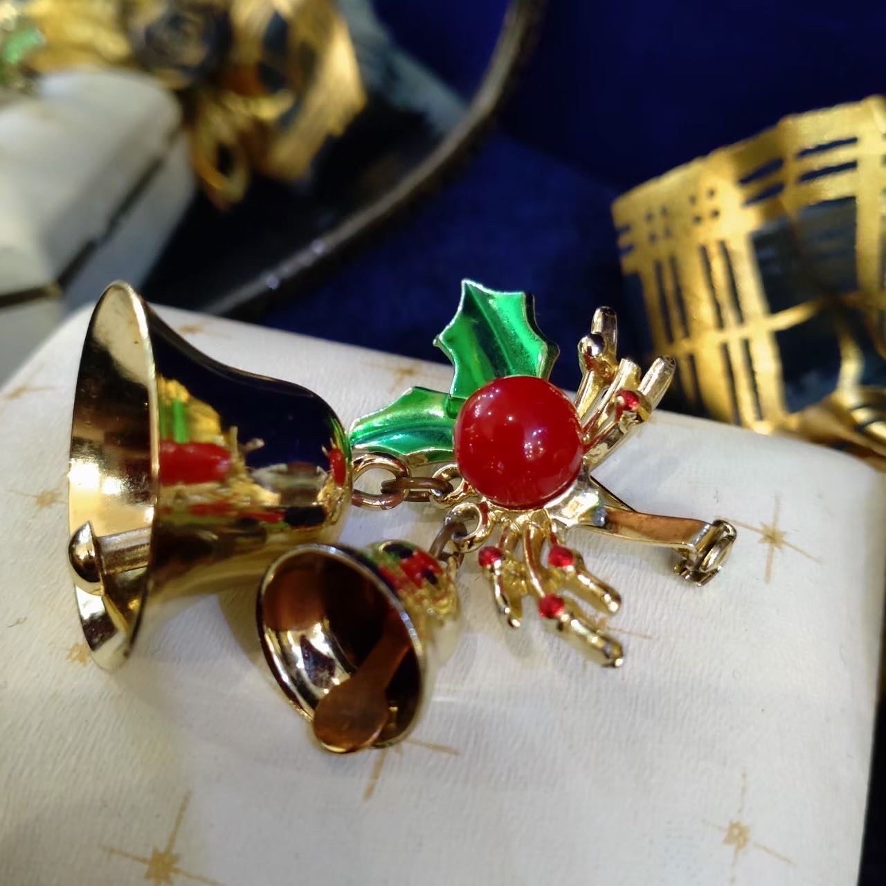 Vintage立體叮鈴聖誕鐘琺瑯聖誕花胸針