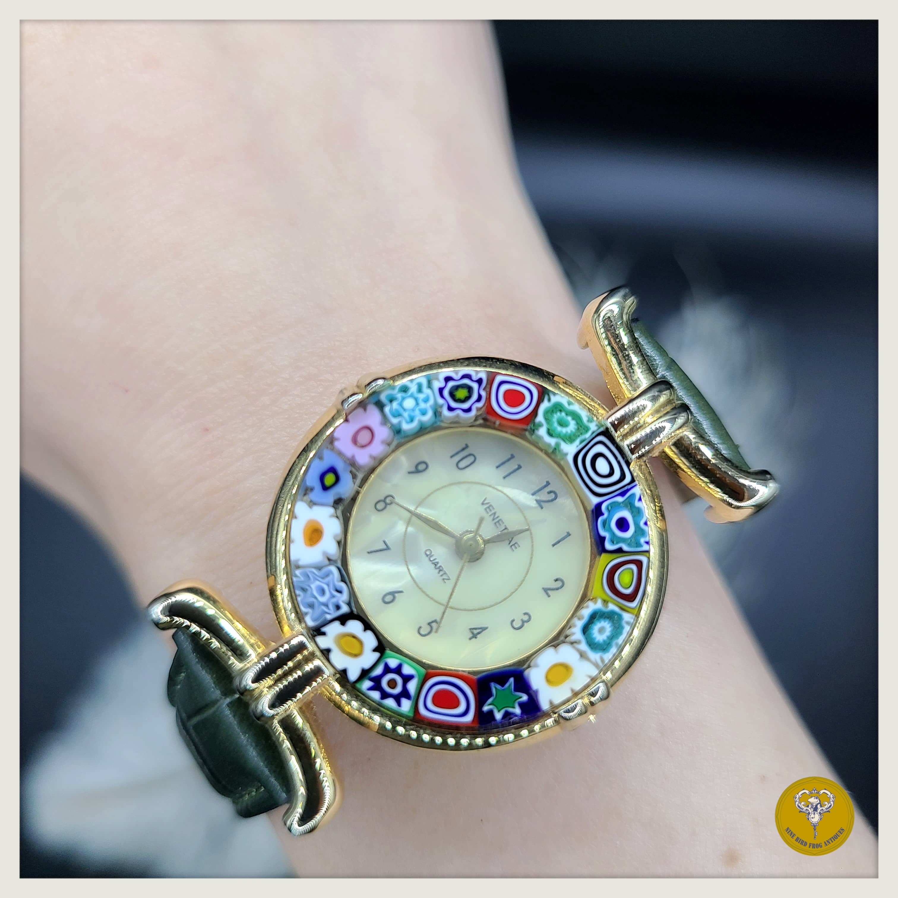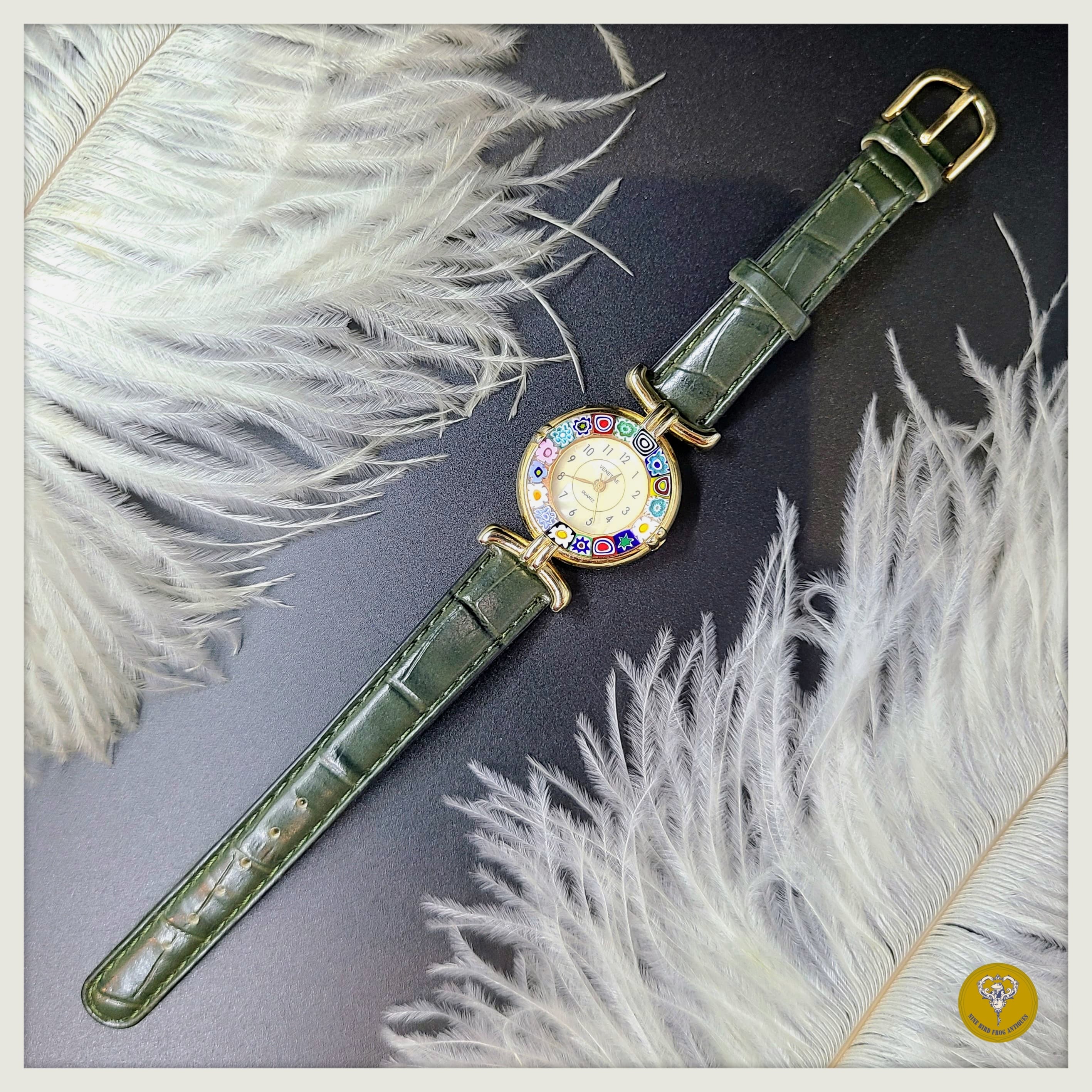 錶面是意大利千花玻璃,配上貝母時盤和特別而且復古感重的墨綠色真皮皮帶,難得的這是庫存新品。 千花玻璃工藝始於十五世紀末,在靠近威尼斯的慕拉諾島生產,這種製造玻璃的方法是利用鐵棒在融爐內取料時,再加上繽紛的色彩原料覆蓋在高溫的玻璃外部,形成一層又一層的套色效果,將玻璃趁高溫時拉長成維細棒,冷卻後用特殊工具切片,形成千花圖案。 錶帶長15.3cm~18.5cm,手錶闊2.7cm