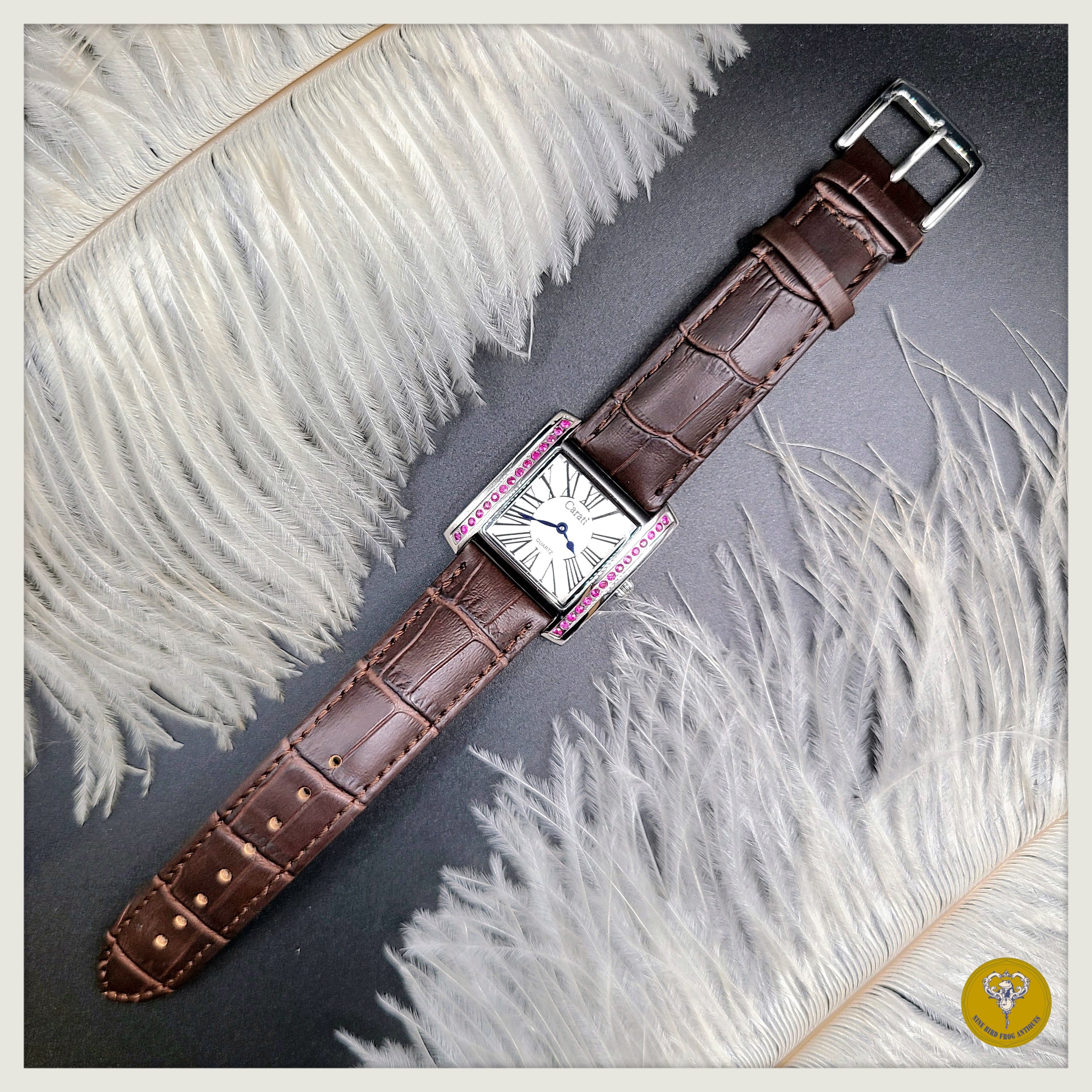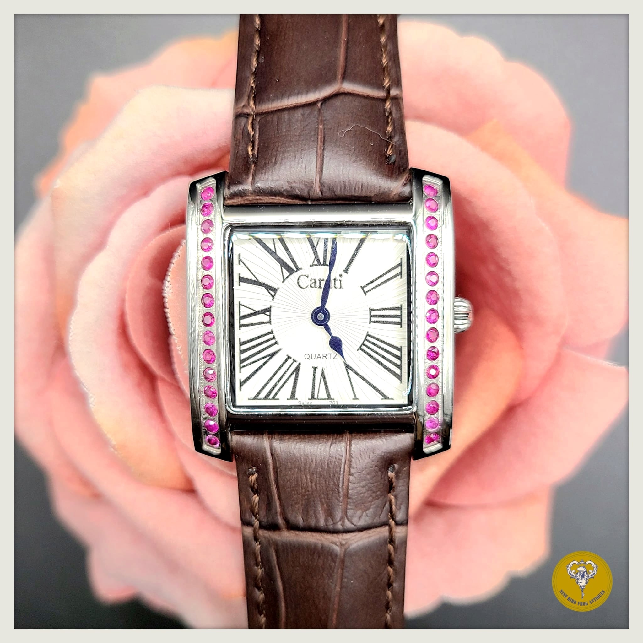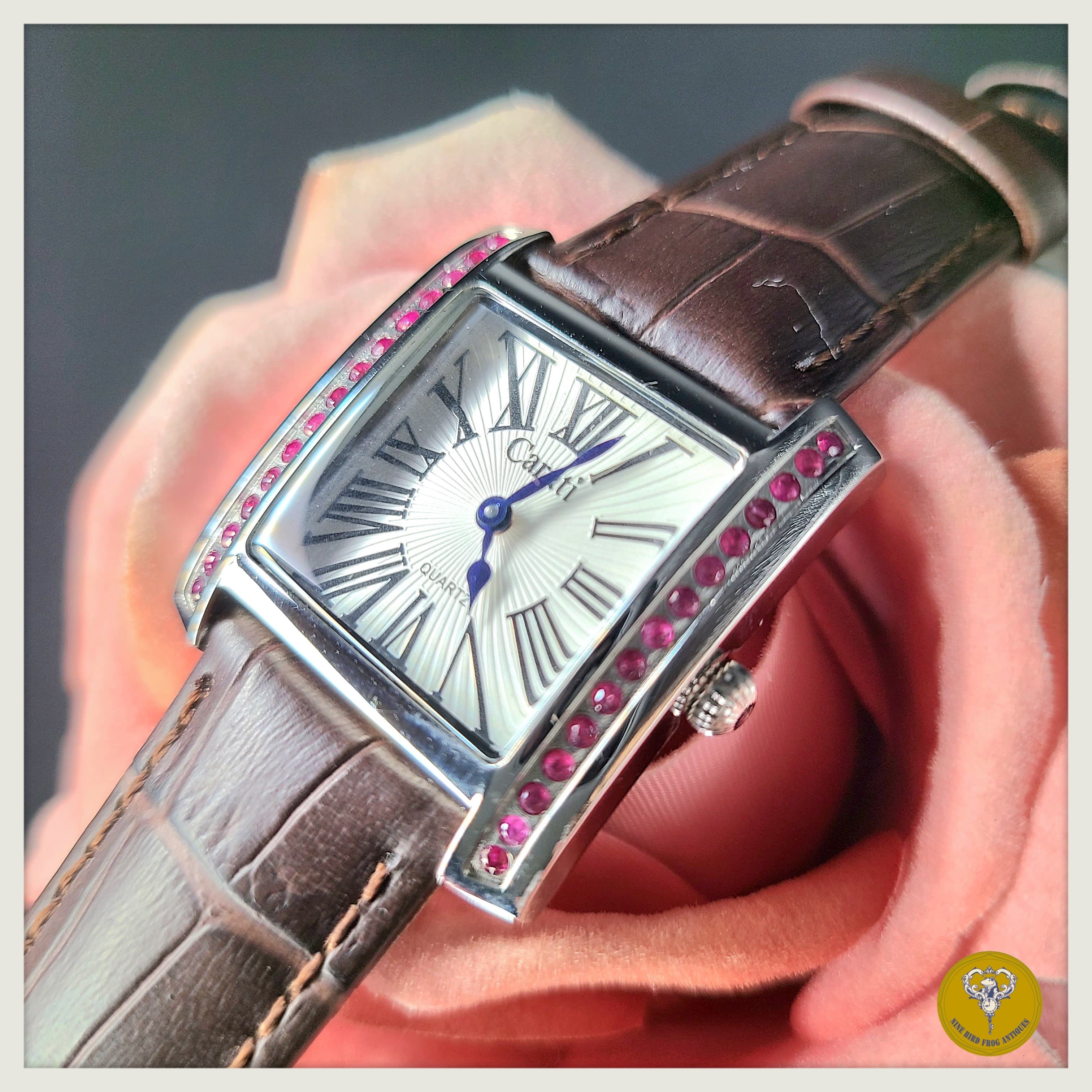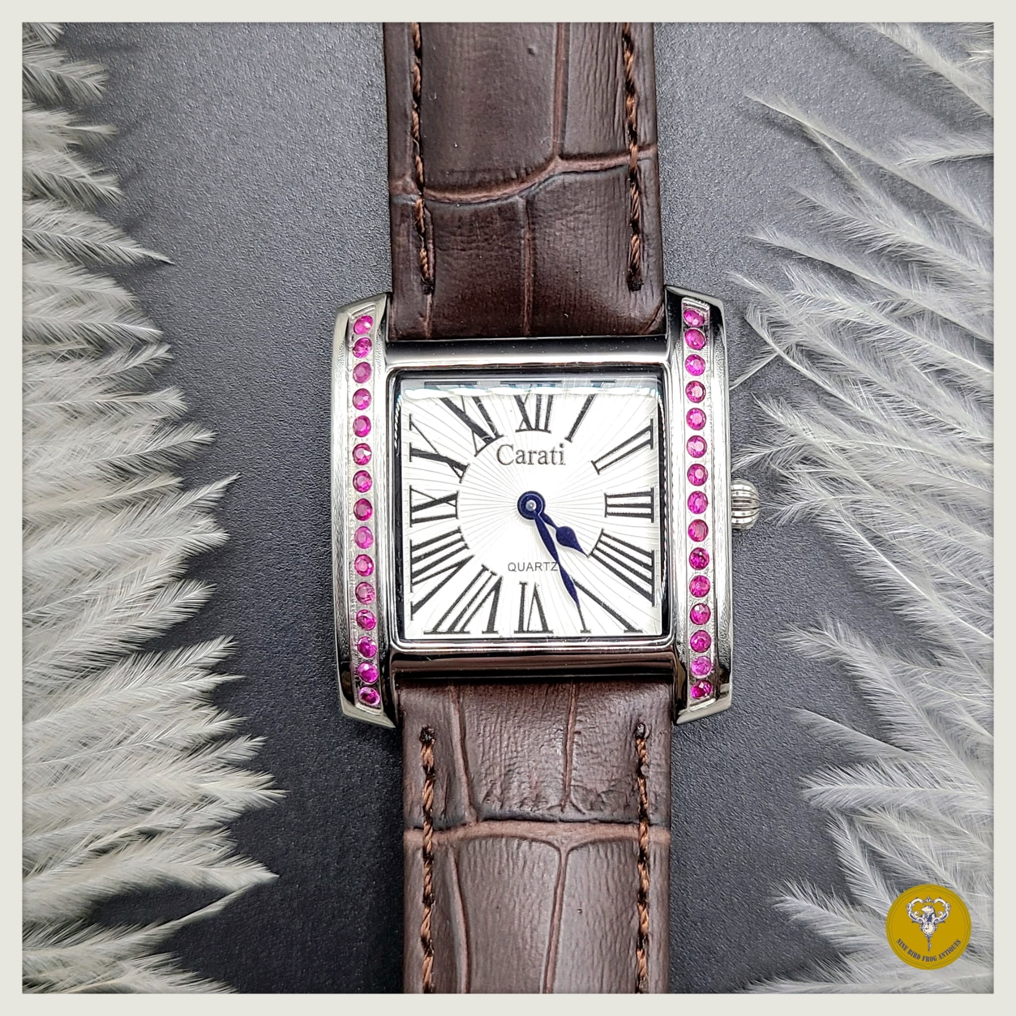 經典復古的長方形錶面兩側各鑲有15顆天然紅寶石,錶面採用羅馬數字配上白色線條。Carati 是珠寶品牌,其手錶也注重細節,如珠寶般高貴精緻,設計易於配襯,庫存新品石英錶運作良好。 Carati是一個專注於高端珠寶的品牌,珠寶設計來自意大利,以精緻的設計和高品質的材質而聞名。融合了現代和傳統的元素,常常具有優雅和獨特的美感。 錶盤29x26mm